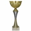 Pokal izdelan iz kovinske čaše in kamnitega podstavka.